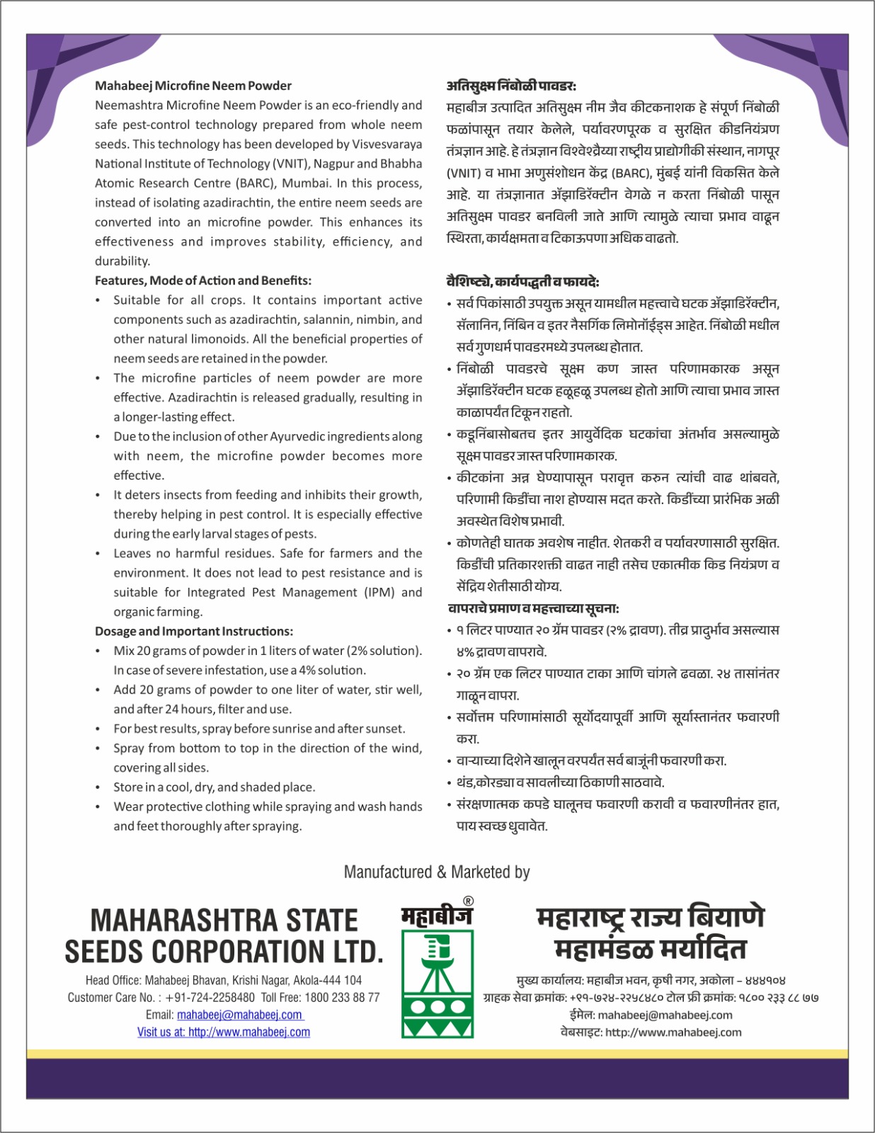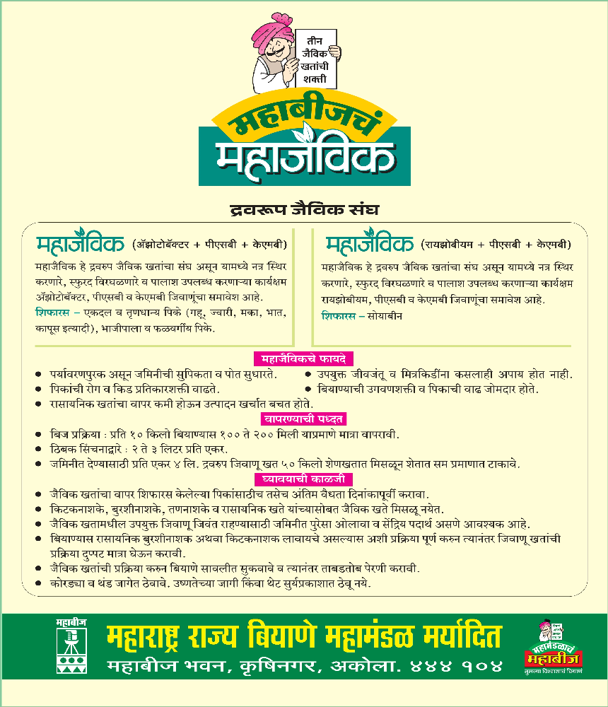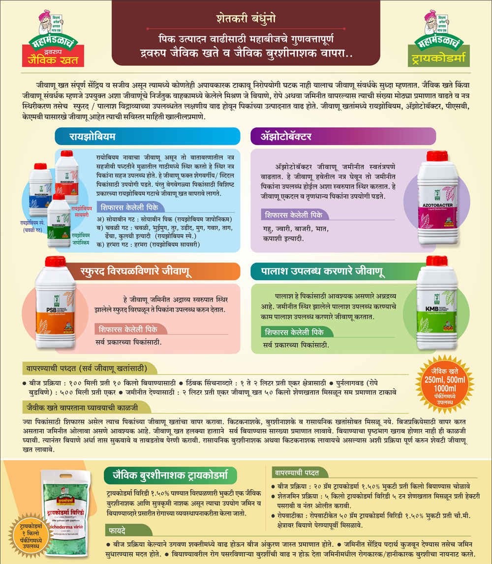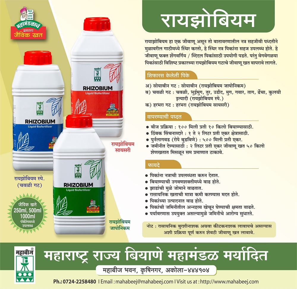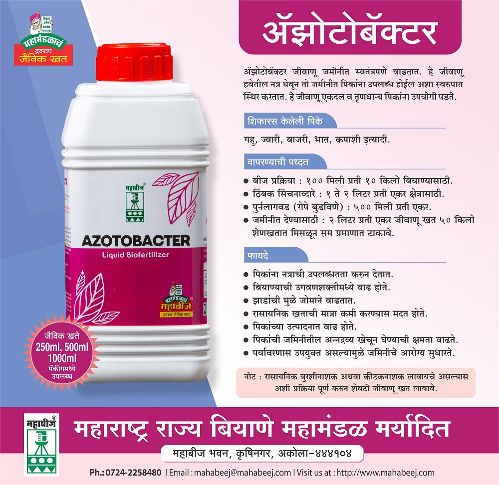 महाबीज २०१९ पासून राज्यातील शेतकऱ्यांना दर्जेदार द्रव जैविक खतांचा पुरवठा करत आहे. तथापि, बाजारातील कल लक्षात घेऊन दर्जेदार द्रव जीवाणू समूह विकसित करून पुरवठा करण्याचा निर्णय घेण्यात आला. त्यानुसार, गेल्या तीन वर्षांत अनेक चाचण्या आणि चुकांनंतर, एमएसएससीएलने दोन दर्जेदार जीवाणू समूह विकसित केले आहेत, म्हणजेच महाजैविक रायझो (रायझोबियम, पीएसबी आणि केएमबी) आणि महाजैविक अझोटो (अझोटोबॅक्टर, पीएसबी आणि केएमबी).
