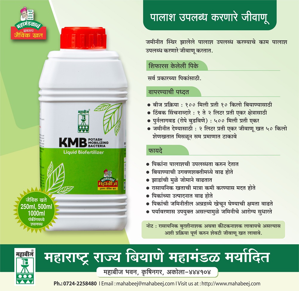 महाबीज नायट्रोजन स्थिरीकरण करणारे जिवाणू (ऱ्हायझोबियम, अझोटोबॅक्टर ), फॉस्फरससाठी फॉस्फेट विरघळवणारे जिवाणू (PSB), पोटॅशियमसाठी पोटॅश गतिशील करणारे जिवाणू (KMB) तयार करते, ही सर्व जैविक खते द्रव स्वरूपात असतात.