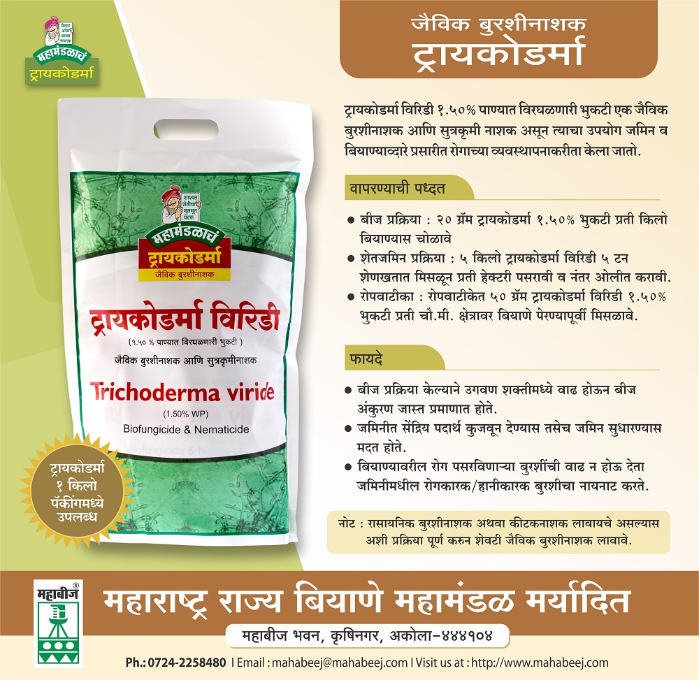 ट्रायकोडर्मा व्हिराइड : ट्रायकोडर्मा व्हिराइड १.५% हे एक पर्यावरणपूरक जैविक बुरशीनाशक आणि सूत्रकृमीनाशक आहे. ते पिकांच्या बियाण्यांद्वारे आणि मातीतून पसरणाऱ्या रोगांवर प्रभावीपणे नियंत्रण ठेवते.